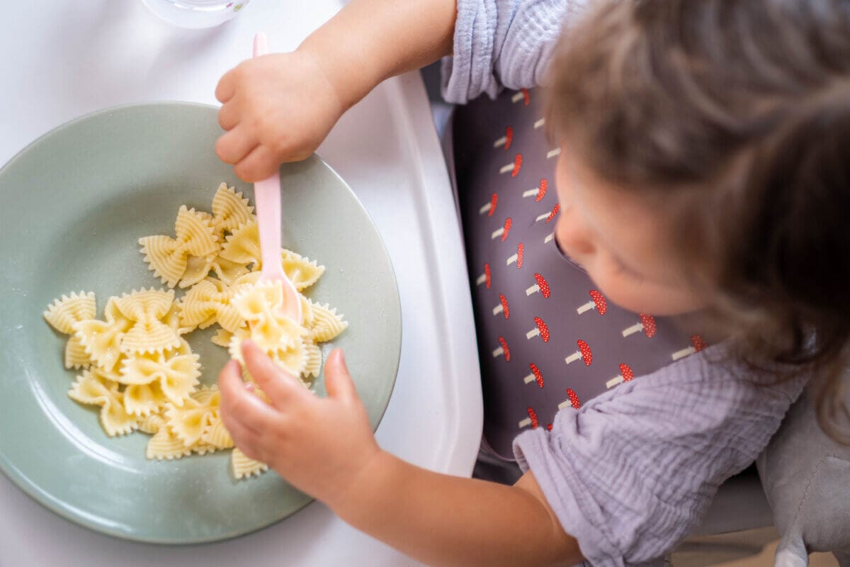 - De 18 meses a 2 años: Ya pueden comer los mismos tipos y formas de pasta que los adultos. Simplemente necesitarán ayuda de vez en cuando para pincharla con el tenedor o cargar la cuchara.